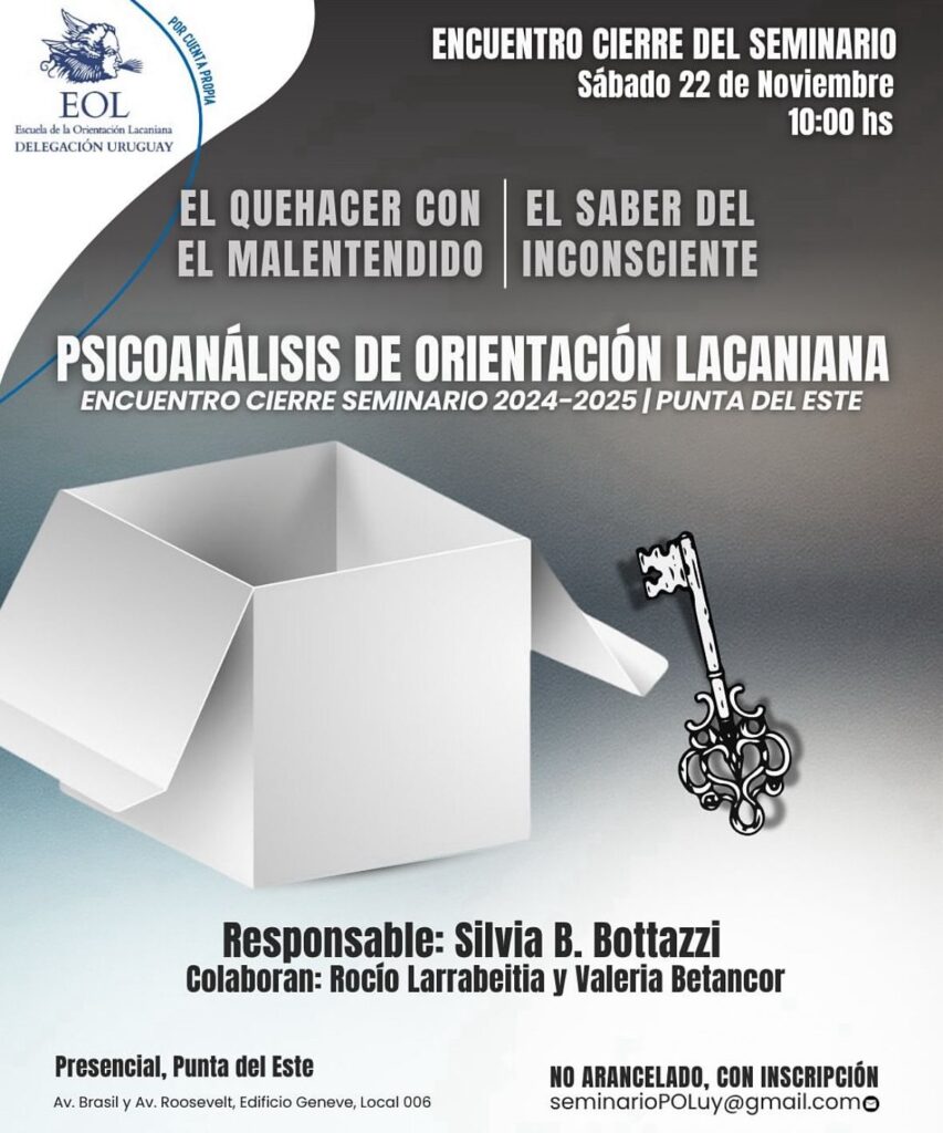 El cierre del seminario “El quehacer con el malentendido” y “El saber del inconsciente” de la EOL Delegación Uruguay fue una jornada especialmente orientada al intercambio y a la conversación. En ese marco, presenté un caso clínico para reflexionar, junto a otros colegas, sobre la práctica analítica, el lugar del analista y los efectos que […]